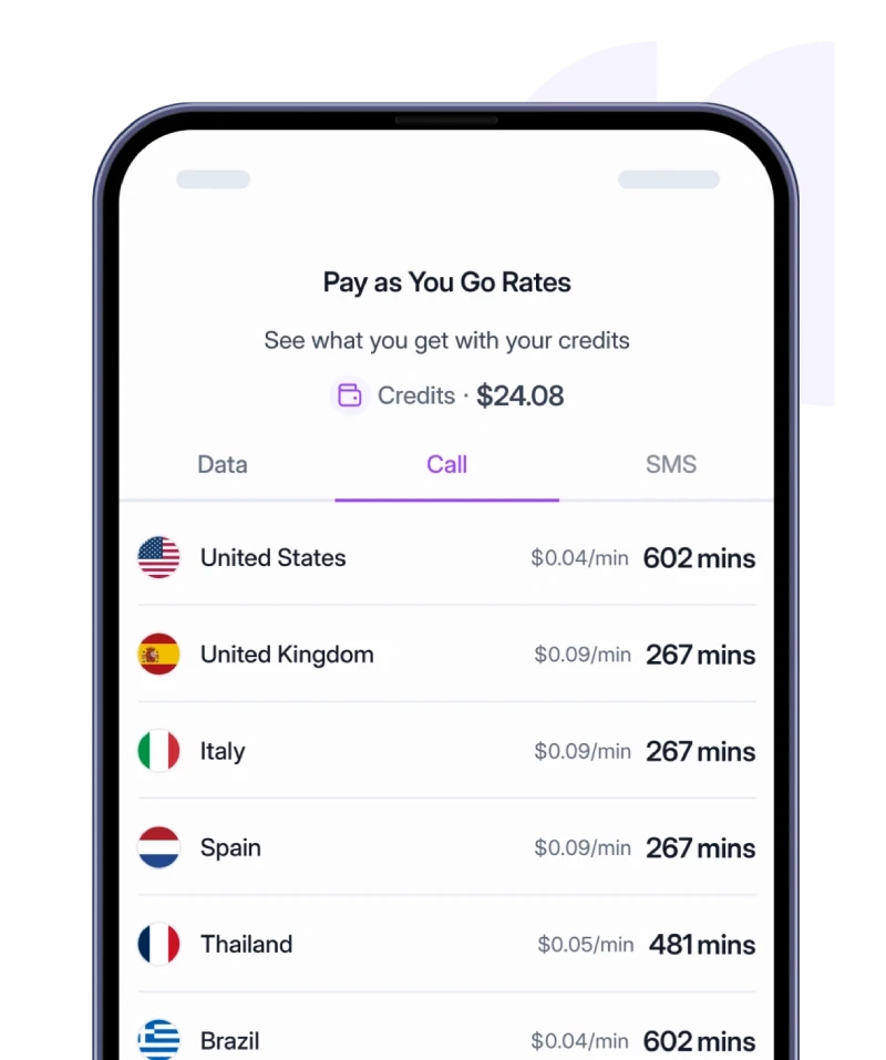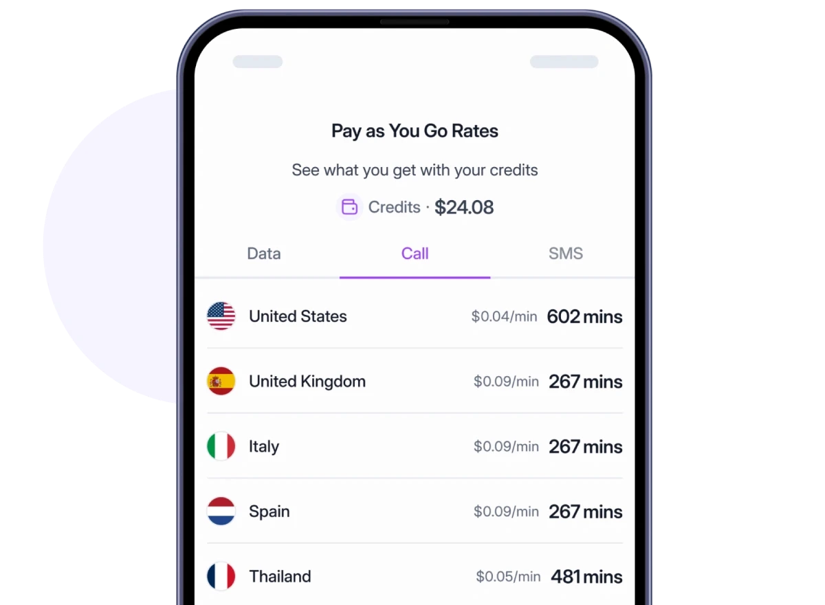Roamlessアプリを使用することで、アカウントに十分なRoamlessクレジットがあり、かつインターネット接続が有効であれば、世界中のあらゆる宛先へ通話を発信できます。Roamlessアプリを開き、通話タブに移動して、国番号(+から始まる)を含めて発信先番号を入力するだけで、通話時間に応じた従量課金でグローバルに音声通話をご利用いただけます。(なお、Roamless通話はVoIP(ボイスオーバーインターネットプロトコル)技術を使用しているため、端末の標準電話アプリではなく、Roamlessアプリからご利用いただく必要があります。)