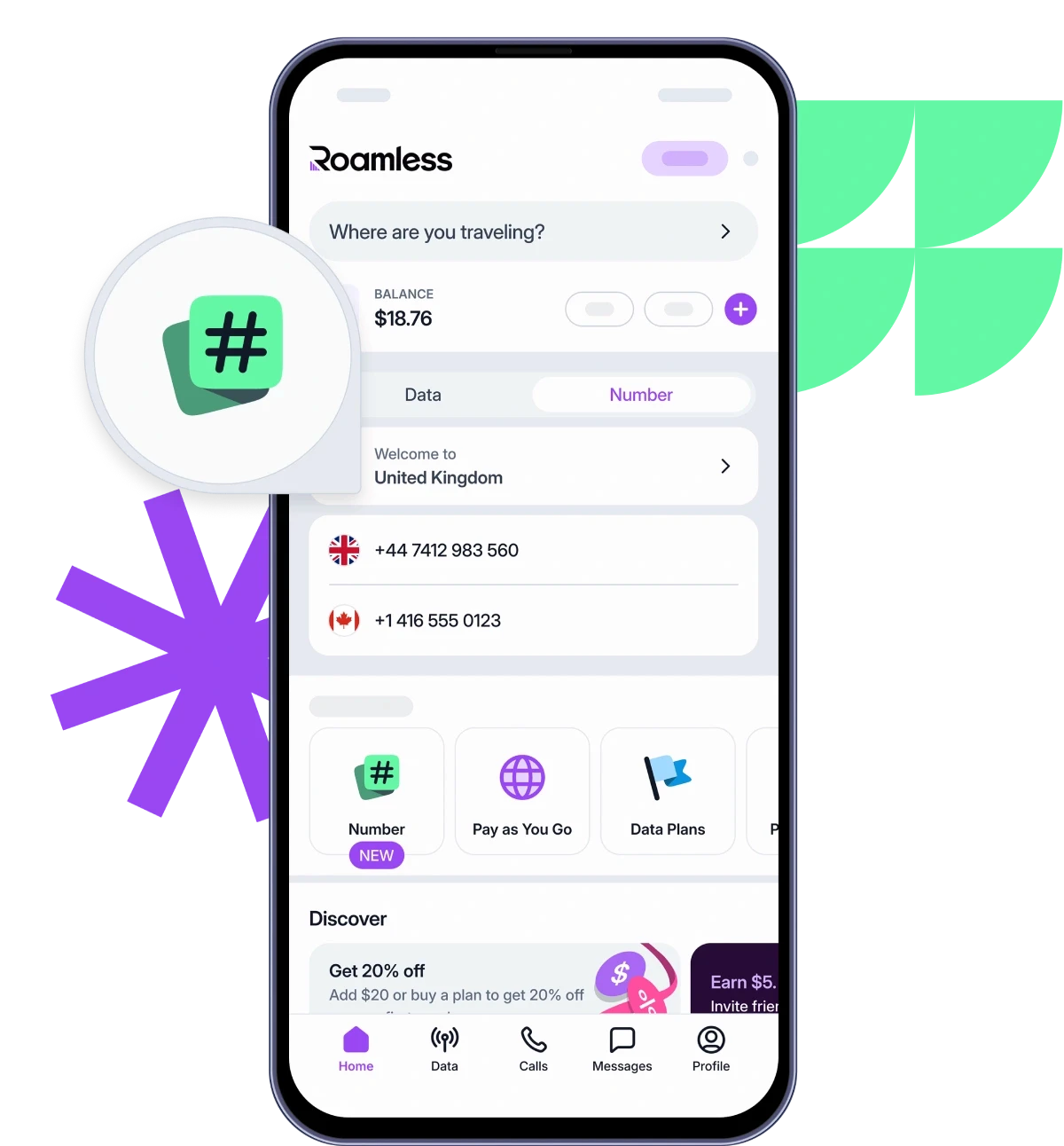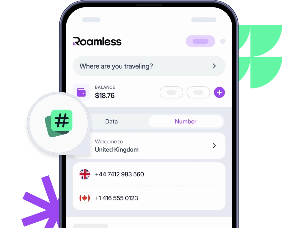 Roamless番号は、Roamlessモバイルアプリ内の機能であり、国際電話番号をサブスクリプション登録できるサービスです。この番号は発信者IDとして使用でき、通話の発着信およびSMSの送受信(2要素認証(2FA)やワンタイムパスワード(OTP)を含む)にご利用いただけます。(なお、RoamlessのeSIMはデータ通信専用eSIMであるため、eSIM自体には専用の電話番号は付与されません。)