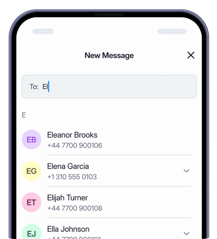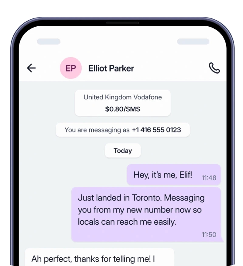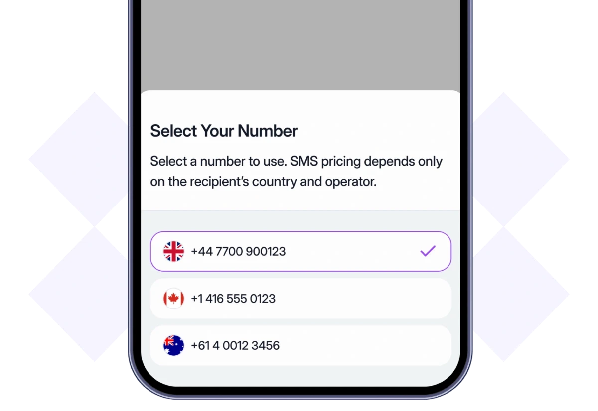 はい。Roamless番号に加えて認証済みの電話番号をお持ちの場合、「送信元」として使用する番号を選択できます。(なお、認証済みの電話番号およびRoamless番号のいずれでもSMS送信は可能ですが、Roamlessアプリ内でSMSを受信できるのはRoamless番号のみです。)